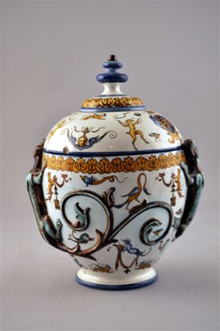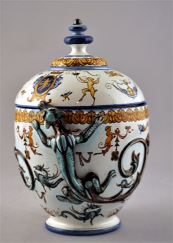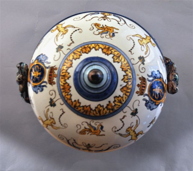 POT COUVERT "AUX SALAMANDRES" en faïence, sur la panse duquel s'enroulent deux salamandres en relief de couleur vert d'eau. Décor polychrome de médaillon couronné et animaux fantastiques sur fond blanc dans le goût de la Renaissance italienne (quatre éclats au couvercle, pied restauré).