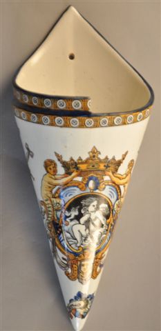 CORNET en faïence à bords lisses enroulés, à décor de l'amour au dauphin dans un écusson couronné présenté par deux amours encadrés de trophées sur fond blanc dans le goût de la Renaissance italienne. Frise géométrique au col.