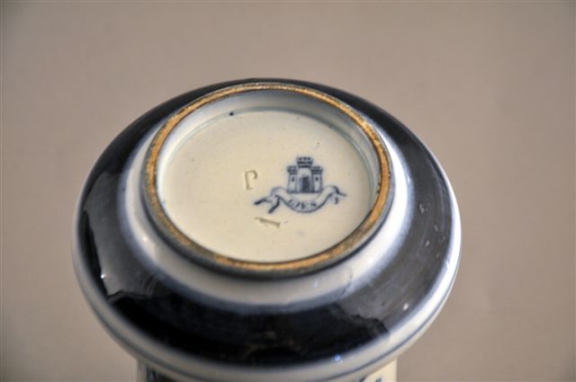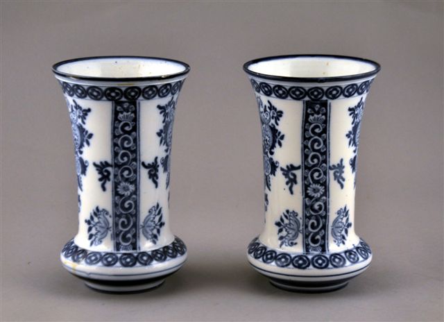PAIRE DE VASES CORNET À PIED BOULE en faïence, à décor en camaïeu de bleu de lambrequins et de frises fleuries dans le goût de Delft (un petit éclat à chaque col).