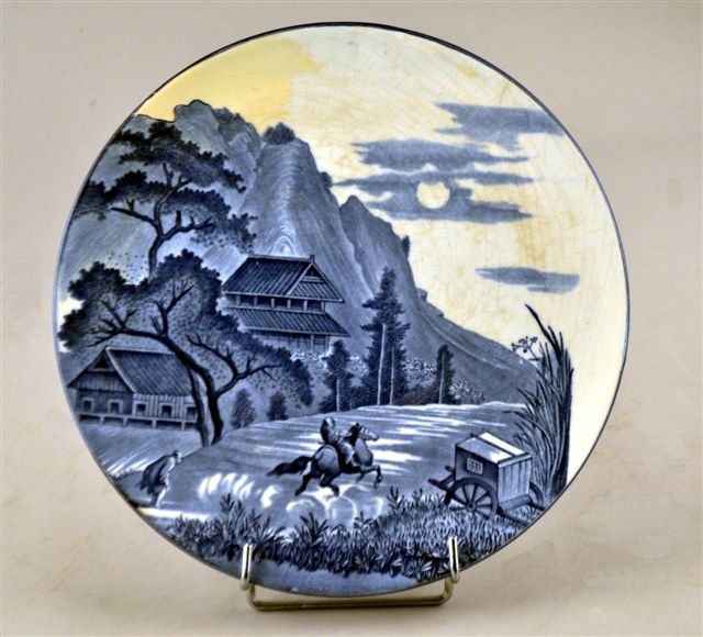 PLAT SUR TALON en faïence à bord uni, à décor en camaïeu de bleu d'un cavalier s'enfuyant à travers les montagnes, dans le goût de Delft oriental.