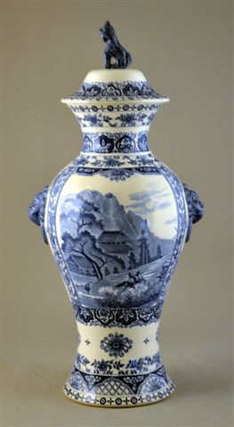 POTICHE COUVERTE en faïence surmontée d'un chien de Fô, à décor oriental, en camaïeu de bleu, de scènes dans des cartouches : d'une jonque d'une part et d'un cavalier d'autre part séparés par des anses à gueule de lion et encadrées de frises florales géométrisées dans le goût de Delft (fêle au fond).