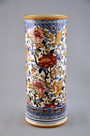 PORTE-PARAPLUIE ROULEAU en faïence, à décor de pivoines polychrome dans le goût de Delft oriental (importants fêles au col et au socle).