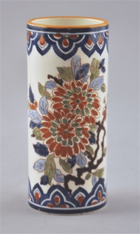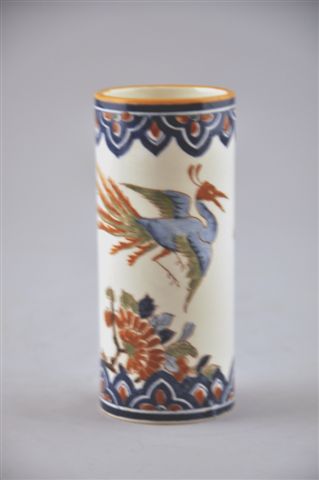 Petit VASE ROULEAU en faïence, à décor polychrome d'oiseau fantastique et de fleurs épanouies où dominent les tons de brun et de bleu dans le goût de Delft oriental.