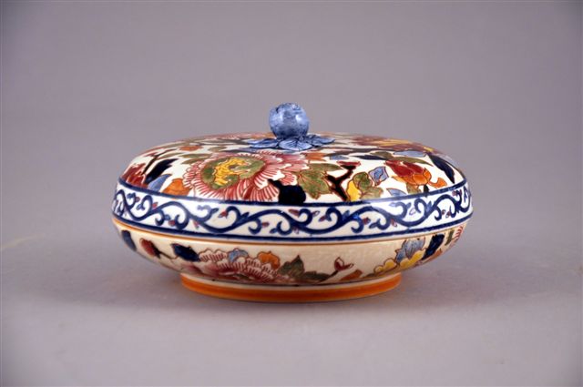 BONBONNIÈRE RONDE en faïence, à décors de fleurs polychromes dans le goût de Delft, le fretel en forme de fruit bleu (accidents, restauration, couvercle rapporté).