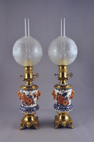 PAIRE DE LAMPES À HUILE en faïence en forme de vase à pied couvert, prise à anneaux, à décor polychrome de fleurs et d'oiseaux dans le goût de Delft oriental. Riche monture de bronze doré aux éléphants (deux anneaux accidentés, fêle sur un vase et un couvercle restauré).