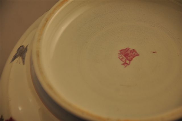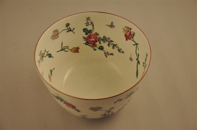 VASQUE "BOL DE RIZ" en faïence, à décor champêtre en décalcomanie sous émail, avec des boutons de roses, branches de rosiers, roses, pivoines et pensées, des papillons et des abeilles dans le goût de Marseille,.