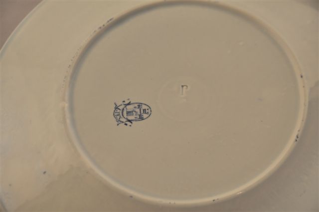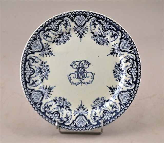 ASSIETTE CHIFFRÉE "ER" en faïence à bord uni, à décor en camaïeu de bleu au centre du chiffre "ER" entrelacé, et sur l'aile du décor dit à la guirlande et au lambrequin dans le goût de Rouen.