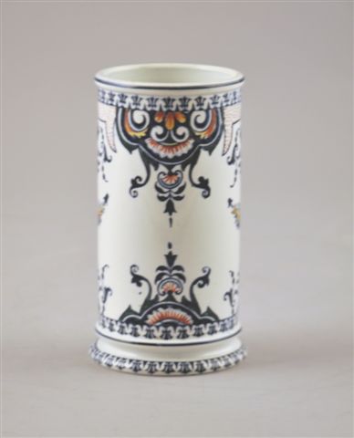 Petit VASE ROULEAU en faïence, à décor en camaïeu de bleu rehaussé de rouge, de jaune d'orange et de vert de guirlandes et de lambrequins sur fond blanc laiteux dans le goût de Rouen.