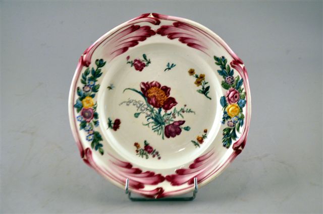 ASSIETTE "BEYERLÉ" en faïence à bord en relief de style rocaille, à décor polychrome : le centre d'une rose dans le goût de Marseille à l'abeille, sur l'aile de feuillages en relief pourpre, de peignés et d'une guirlandes de boutons de roses et de myosotis en relief. Décor caractéristique des productions de Beyerlé à Niederviller au XVIIIème siècle.