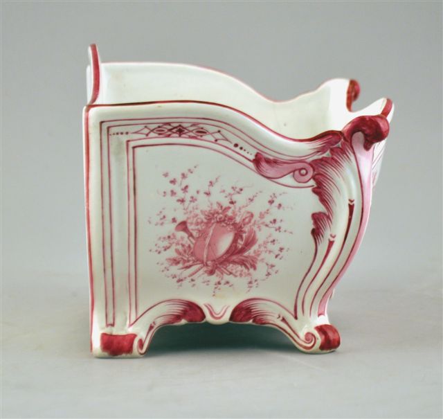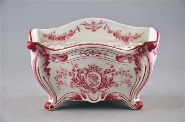 COMMODE PIQUE-FLEURS ROCAILLE en faïence, à décor en camaïeu de pourpre d'un portrait dans un médaillon, d'instruments de musique et de peignés feuillagés soulignant les lignes du meuble dans le goût de Saxe (dans l'état : cheveu, restauration ; pique-fleurs rapporté ?).
