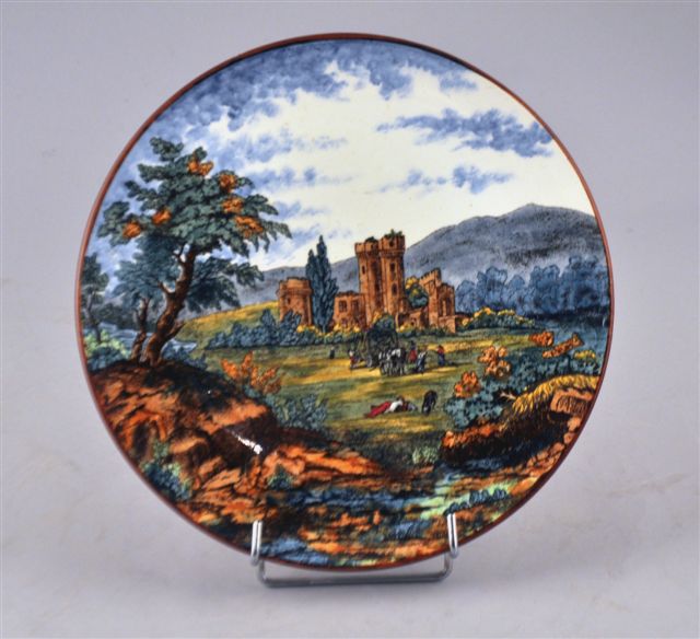 ASSIETTE "AUX RUINES" en faïence à bord uni, à décor polychrome en plein d'un château fort, au pied duquel des paysans ramassent le foin dans le goût de MAROIS.