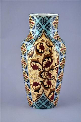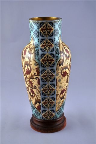 VASE POTICHE en faïence à décor polychrome néogothique de rinceaux, chardons stylisés et entrelacs. Percé au fond.