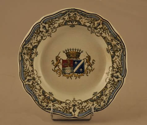 ASSIETTE HÉRALDIQUE "AUX VENDANGES" en faïence à bord festonné, à décor en impression de noir rehaussé de couleur : au centre d'une armoirie double à couronne de baron, supportée par une licorne de chaque côté, l'aile décorée d'une riche frise alternant enfants foulant les raisins dans un pressoir, chimères et vases, dans le goût de la Renaissance italienne.