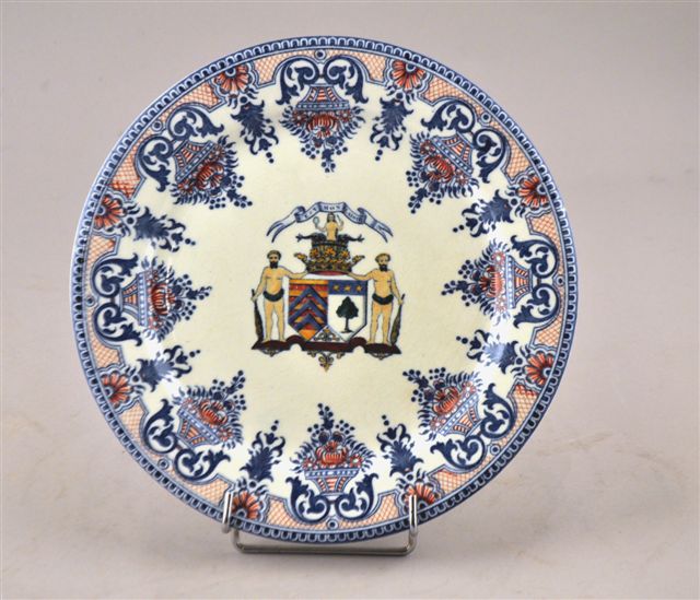 ASSIETTE HÉRALDIQUE "AUX HERCULES" en faïence à bord uni, à décor au centre de doubles armoiries flanquées de chaque côté d'Hercule armé d'une massue, dans la goût d'Emile Doepler, surmontées d'une couronne de baron fantaisistes, d'une divinité à l'intérieur d'un pressoir, et de la devise "C'EST MON PLAISIR". Aile ornée de ferronneries dans le goût de Rouen.