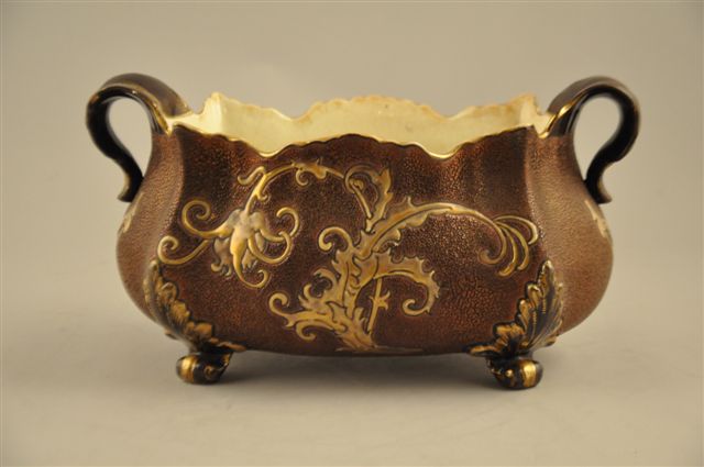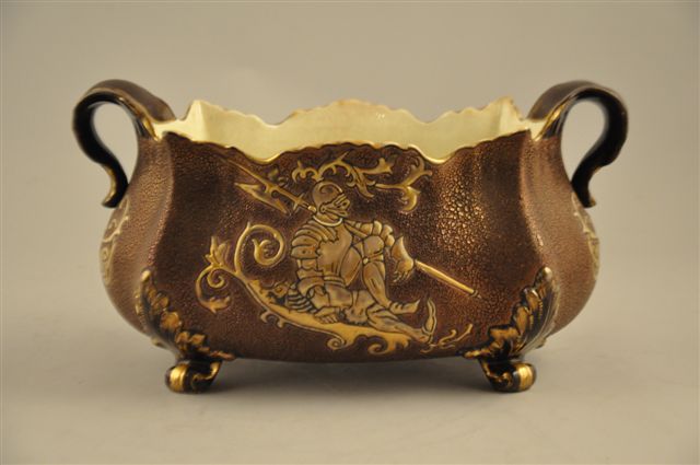 JARDINIÈRE DÉCOUPÉE AU CHEVALIER DE TOLÈDE en faïence, à décor "d'émaux chagrins" reposant sur quatre pieds feuillagés. Un personnage en armure en application d'or mat se détache sur un fond d'émail granuleux marron sombre métallisé. L'intérieur est de couleur ivoire craquelée.