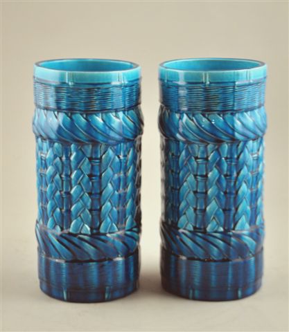 PAIRE DE VASES CYLINDRIQUES "BLEU CANARD" en faïence, à décor en demi-relief imitant une natte en vannerie monochrome dite "bleu canard", dans un bleu sombre présentant une légère variante avec le turquoise. Le haut et la base des vases sont striés horizontalement alors que les parties centrales sont garnies de motifs verticaux issus du tressage d'osier (fonds percés).