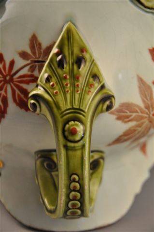 JARDINIÈRE "BERNARD" en faïence, à décor floral d'émaux translucides de fleurs, fruits et feuilles de marronnier avec des applications de feuilles d'or dans le goût de Théodore DECK. L'intérieur de couleur turquoise.
