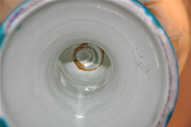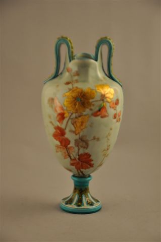 VASE AMPHORE À OREILLES en faïence, à décor floral d'émaux translucides avec des coloris vert jade, terre de sienne, turquoise et violet, et une forte surimpression de feuilles d'or dans le goût de Théodore DECK (dans l'état : pied cassé restauré).
