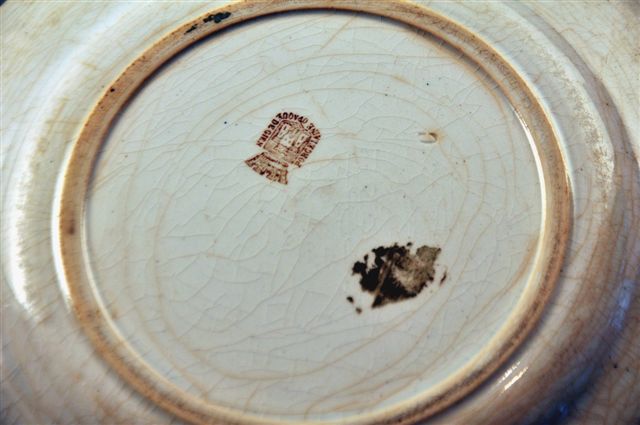 ASSIETTE À "L'OIE" en faïence à bord uni, à décor au pochoir représentant une oie en silhouette noir sur un fond cretonne bleu et rouge.