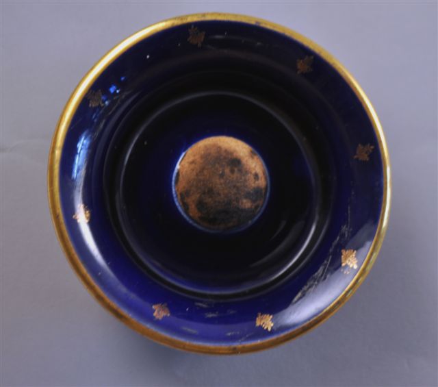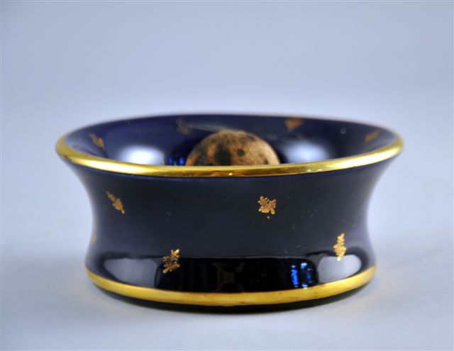 CENDRIER À PIPE en faïence et demi-balle de ping-pong pour faciliter le débourrage, à décor d'un liseré et de feuilles de couleur or sur fond bleu sombre.