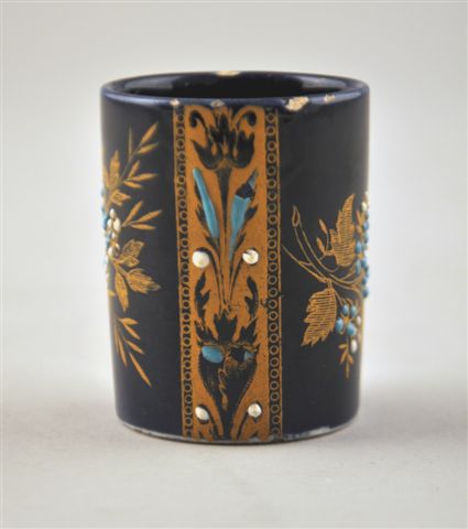 Petit POT CYLINDRIQUE en faïence partie probable d'un service de fumeur, à décor floral de en fins rehauts d'or et de gouttes d'émail opaque blanc et turquoise sur fond bleu sombre. Fond annelé.