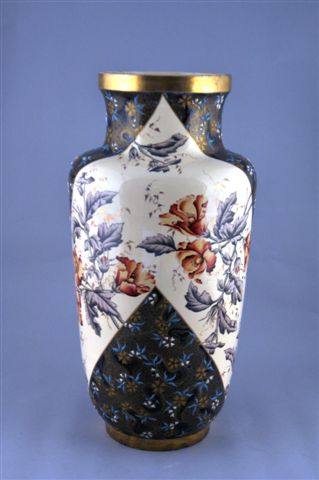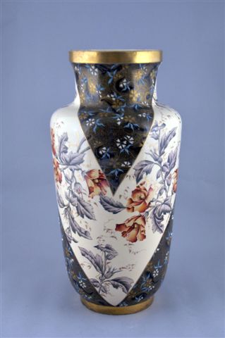 Grand VASE ÉTRUSQUE à col coupé en faïence à décor floral et émaux. Des branches d'hibiscus dans une harmonie de jaune, rouge et vert olive sur un fond ocre parsemé de feuilles dorées sont disposées en bandes diagonales de part et d'autre d'un décor de gouttes d'émail opaque blanches et turquoise sur fond bleu nuit rehaussé de fins motifs à l'or. Le col et le socle ornés d'une bande à l'or (cinq petits éclats sur le socle).