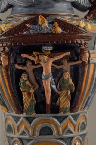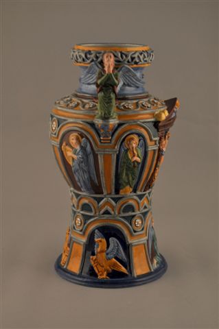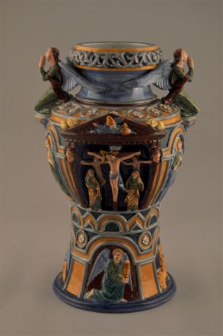 VASE D'AUTEL en faïence polychrome architecturée d'inspiration néo-romane. Au sommet deux Séraphins en prière formant les anses encadrent le Christ en croix entouré des saintes femmes et des deux larrons dans un temple surmonté par Dieu bénissant. Quatre anges musiciens en relief situés dans des niches de part et d'autre dominent le tétramorphe sur le socle.