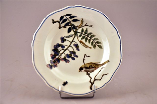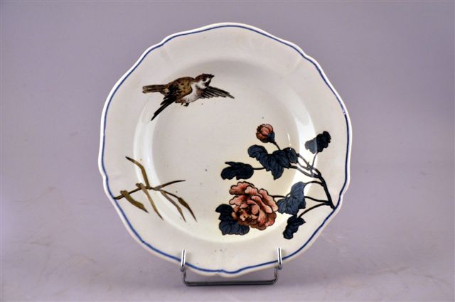 TROIS ASSIETTES JAPONISANTES en faïence à bords festonnés, à décor en plein d'un oiseau jouant avec un insecte près d'une branche de glycine, de raisin ou d'une pivoine, liseré bleu sur l'aile, dans le goût du Japon.