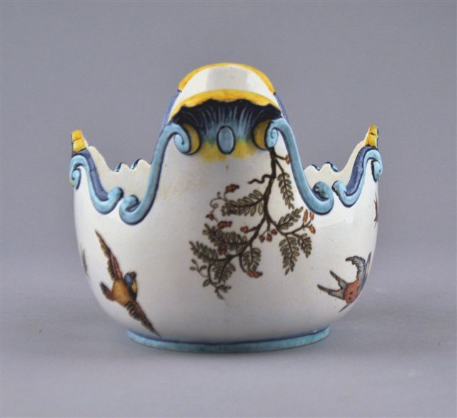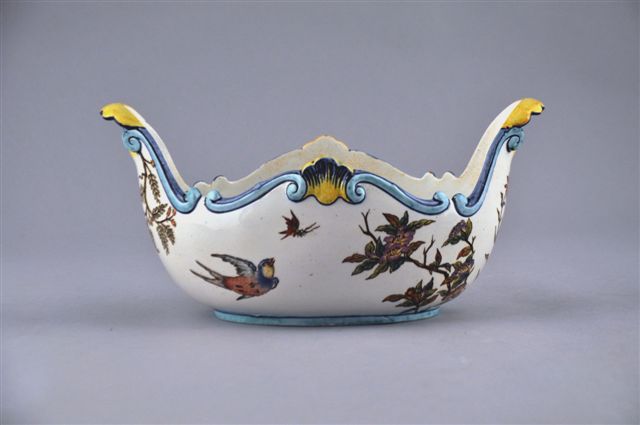 COUPE GONDOLE ROCAILLE en faïence, à décor polychrome floral se détachant sur fond blanc avec un oiseau volant vers un insecte, dans le goût du Japon. Liserés bleus, turquoise et rehauts jaunes.