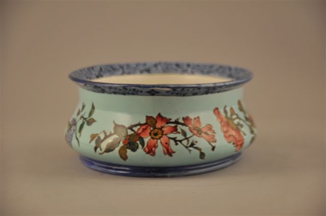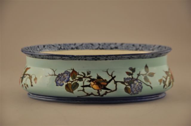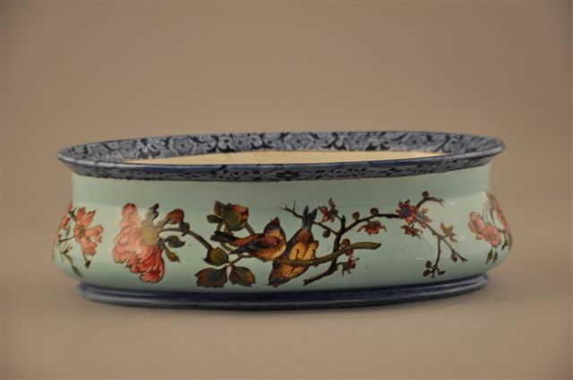 JARDINIÈRE OVALE AUX OISEAUX JAPONAIS en faïence, à décors d'oiseaux branchés sur fond bleu turquoise dans le goût du Japon. Frise feuillagée en camaïeu de bleu sur le contour intérieur du col.