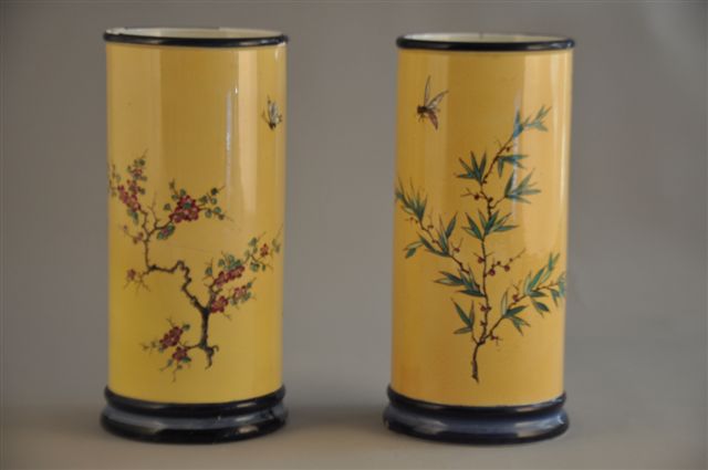 PAIRE DE VASES ROULEAUX en faïence, à décor de moineau perché sur des branchages fleuris dans le goût du Japon. Contour de col et de la base bleu nuit (un vase très accidenté).