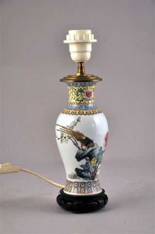 Petite LAMPE À HUILE "DIABOLO" en faïence montée à l'électricité, à décor de faisan branché, de dahlia et de caractères orientaux sur fond blanc dans le goût du Japon. Repose sur un socle en bois dans le goût de la Chine.