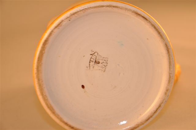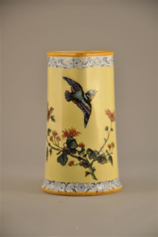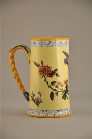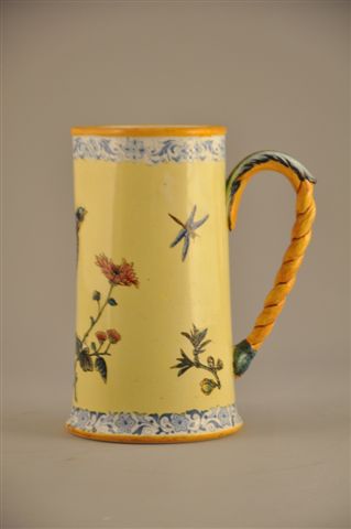 PICHET À ANSE FEUILLAGÉE en faïence, à décor d'un oiseau et d'une libellule au dahlia sur fond jaune dans le goût du Japon. Frise florale en camaïeu de bleu au col et au pied.