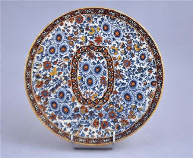 PLAT À TARTE "CACHEMIRE" en faïence, à décor de fleurs stylisées dans un cartouche central sur un tapis de petites fleurs et feuillages dans les tons rouges, jaune et bleus sur fond blanc dans le goût du Cachemire. Une frise souligne le bord du plat.