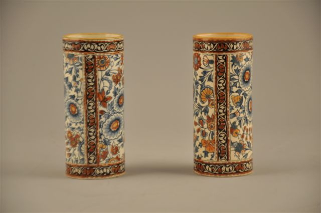 PAIRE DE VASES ROULEAUX en faïence, à décor polychrome floral dans le goût du Cachemire, bordé de frises sur fond noir.