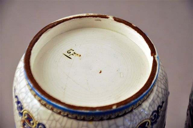 DEUX VASES rouleaux en faïence, à décor à l'émail craquelé de bouquets de fleurs sur fond blanc ou dans un cartouche prune sur fond blanc, réserve fleurie turquoise ou lambrequins stylisés, dans le goût de Longwy. Frise en pied et au col.
