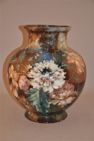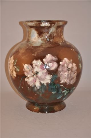 Grande POTICHE BOULE AUX DAHLIAS PAR LAFOND en céramique impressionniste, à décor à la barbotine colorée de dahlias sur fond marron. Signée "LAFOND".