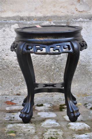 SOCLE en bois noirci sculpté d'une frise dans le goût de la Chine reposant sur quatre pattes de lion sur pied-boule réunies par une entretoise ajourée.