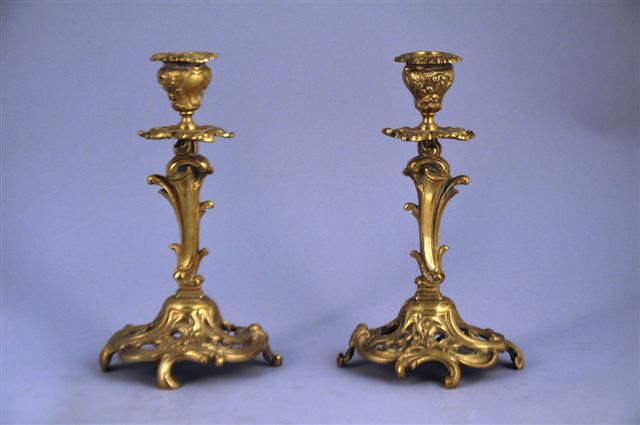 PAIRE de FLAMBEAUX en bronze. Le pied ajouré à volutes feuillagées, fût asymétrique d'inspiration rocaille. Binets en cloche renversée. Style Louis XV. Fin XIXème-début XXème. Haut. 22 cm.