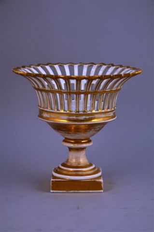 CORBEILLE en porcelaine doré reposant sur base quadrangulaire, la coupe ajourée et évasée.
