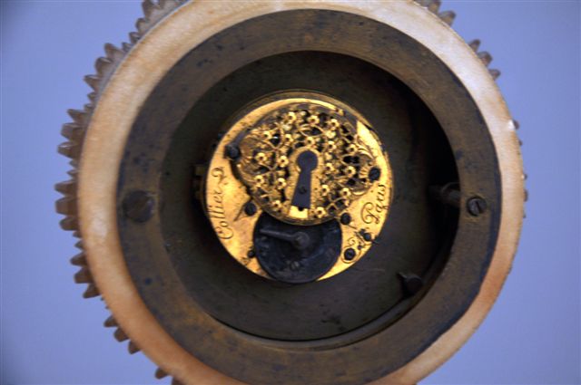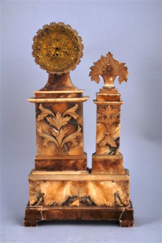 PENDULE en albâtre. Sur une base quadrangulaire reposant sur quatre pieds, de présentes deux piliers inégaux appliqués de motifs feuillagés. Cadran déporté en bronze orné de volutes feuillagées, sur entourage rayonnant.. Le second pilier présente un panier centré d'une fleur. Mouvement à coq signé Collier à Paris.