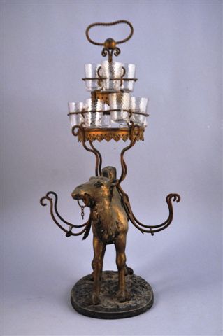 CAVE à liqueur "Chameau" en régule patiné. Un chameau sur terrasse ovale portant une structure porte-verres en laiton redoré. Comporte 12 gobelets en verre dont 6 à côtes torses et 6 "nid d'abeille".