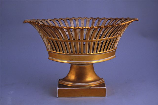 CORBEILLE en porcelaine doré. Base rectangulaire, coupe ajourée en amande.