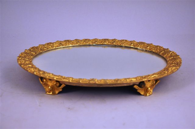 SURTOUT ovale en bronze doré, ciselé et amati. Il repose sur quatre pieds. L'entourage à frise de motifs végétaux stylisés.