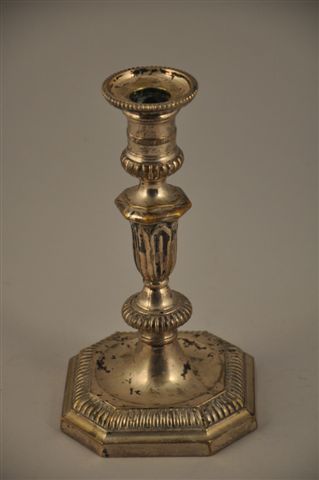 BOUGEOIR en bronze argenté, la base octogonale à décor d'une frise de godrons, le fût godronné et orné de grandes feuilles de palmes, la bobèche à frise de rang de perle. Début XVIIIème. Haut. 22 cm.