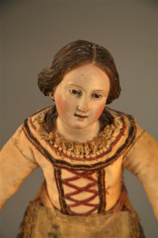 DEUX PERSONNAGES de crèche, en bois sculpté polychrome, fibres végétales et textile. Le premier représentant une bergère et le second un Roi Mage, coiffé d'un turban (Balthazar ?). Yeux en verre.