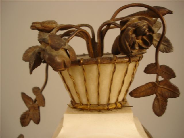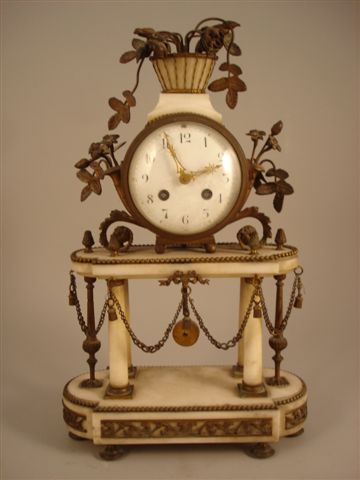 PENDULE portique en albâtre, bronze et laiton doré, reposant sur six pieds. Quatre colonnettes soutiennent un cadran épaulé de fleurs et sommé d'un panier. Ornée de rangs de perles, frise de rinceaux sur la base, chaîne et passementerie retenue par un noeud de ruban. Cadran en émail à chiffres arabes. Aiguilles dorées et ciselées.