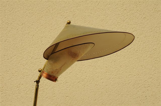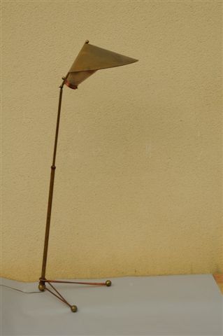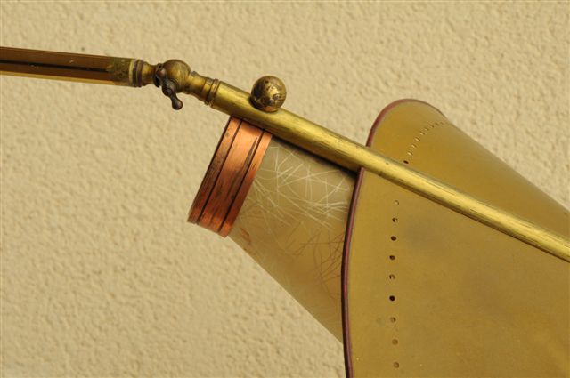 LAMPADAIRE en laiton doré et cuivré, tôle, fût téléscopique, abat jour orientable.