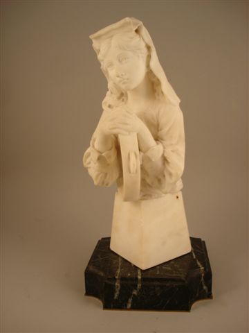 Jeune femme au tambourin. Marbre blanc. Socle.