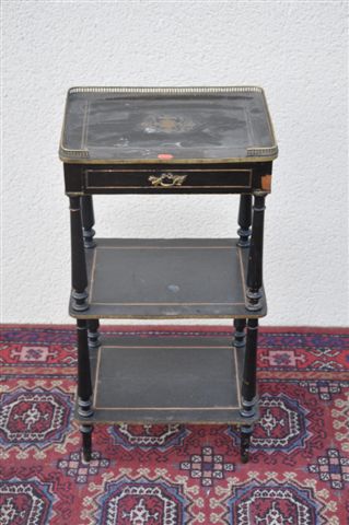 TABLE de SALON en bois noirci et placage de bois noirci. Elle ouvre à un tiroir en ceinture. Pieds et montants tournés. Deux entretoises formant étagère. Le dessus à galerie de laiton, marqueté d'un cartouche feuillage en laiton gravé.